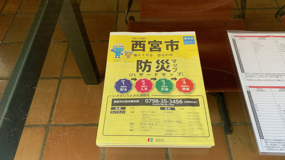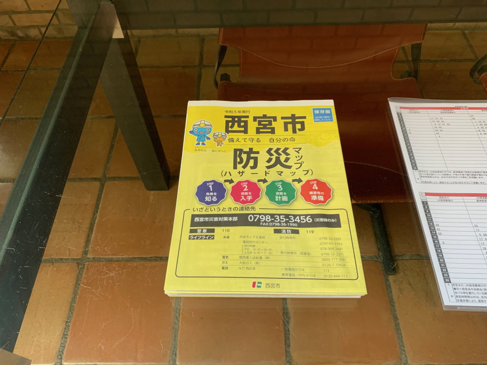 今回の安全講習会で配布頂いた”保存版 西宮市防災ハザードマップ” を、クラブハウスエントランスの受付テーブルに置いております。ヨットハーバーへは西宮市以外の方も来られると思いますので、災害発生時に備え、避難場所の確認等の情報確認用に艇の目につくところに置いて、是非ご一読ください。